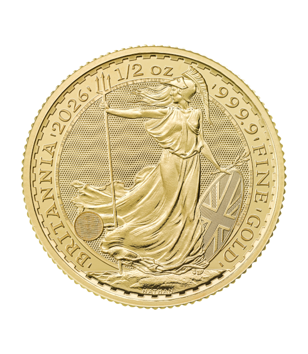 - Reverse: Depicts Britannia, designed by Philip Nathan, standing resolute with her trident and shield — an everlasting symbol of maritime power and protection. Inscriptions read “BRITANNIA,” “2026,” “1/2 OZ,” and “999.9 FINE GOLD.” The intricate design incorporates the Royal Mint’s four state-of-the-art security features, ensuring every coin is as secure as it is beautiful