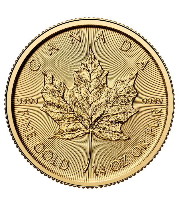 - Reverse: Showcases the celebrated Canadian maple leaf, engraved with remarkable clarity and precision. Surrounding inscriptions read “CANADA,” “9999,” “FINE GOLD,” and “1/4 OZ OR PUR.”