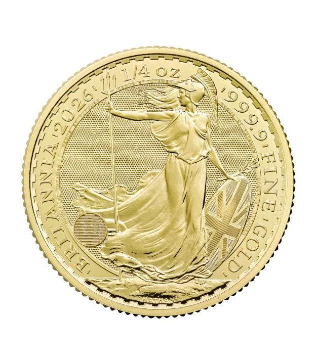 - Reverse: Features the iconic Britannia by Philip Nathan, depicted standing firm with her trident and shield — a representation of strength, vigilance, and the enduring spirit of the British Isles. Inscriptions include “BRITANNIA,” “2026,” “1/4 OZ,” and “999.9 FINE GOLD.” Integrated security elements enhance both authenticity and visual appeal