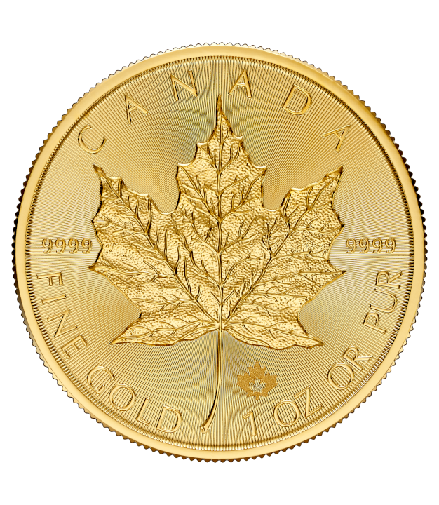 Reverse: Displays the iconic sugar maple leaf, rendered with fine detail and exceptional dimensionality. Surrounding inscriptions read “CANADA,” “9999,” “FINE GOLD 1 OZ OR PUR.”